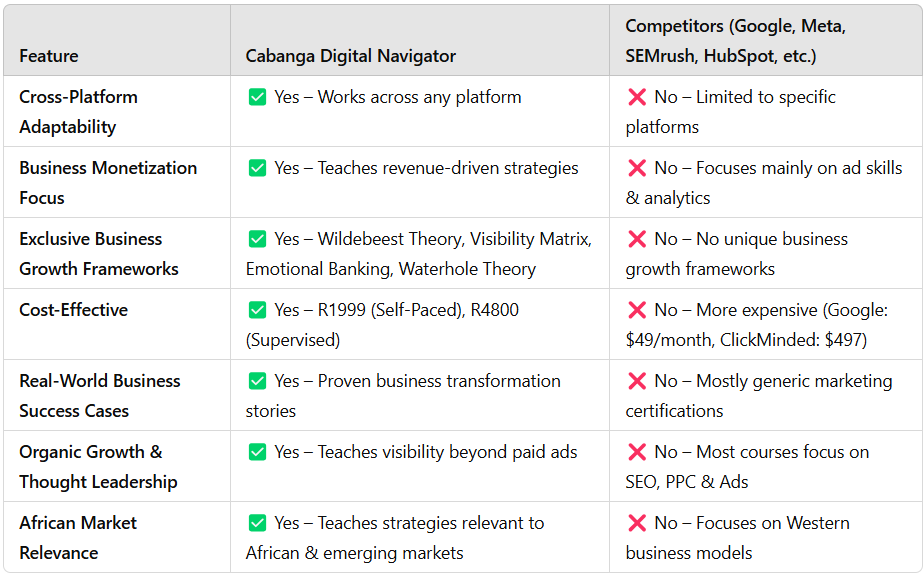 Cabanga Digital Navigator is an advanced digital marketing certification program designed to equip business owners, marketers, and entrepreneurs with the skills to dominate their online presence. Refined through 20 years of business experience, research, and real-world testing, this proven framework was perfected in January 2025 to help professionals master digital strategy.